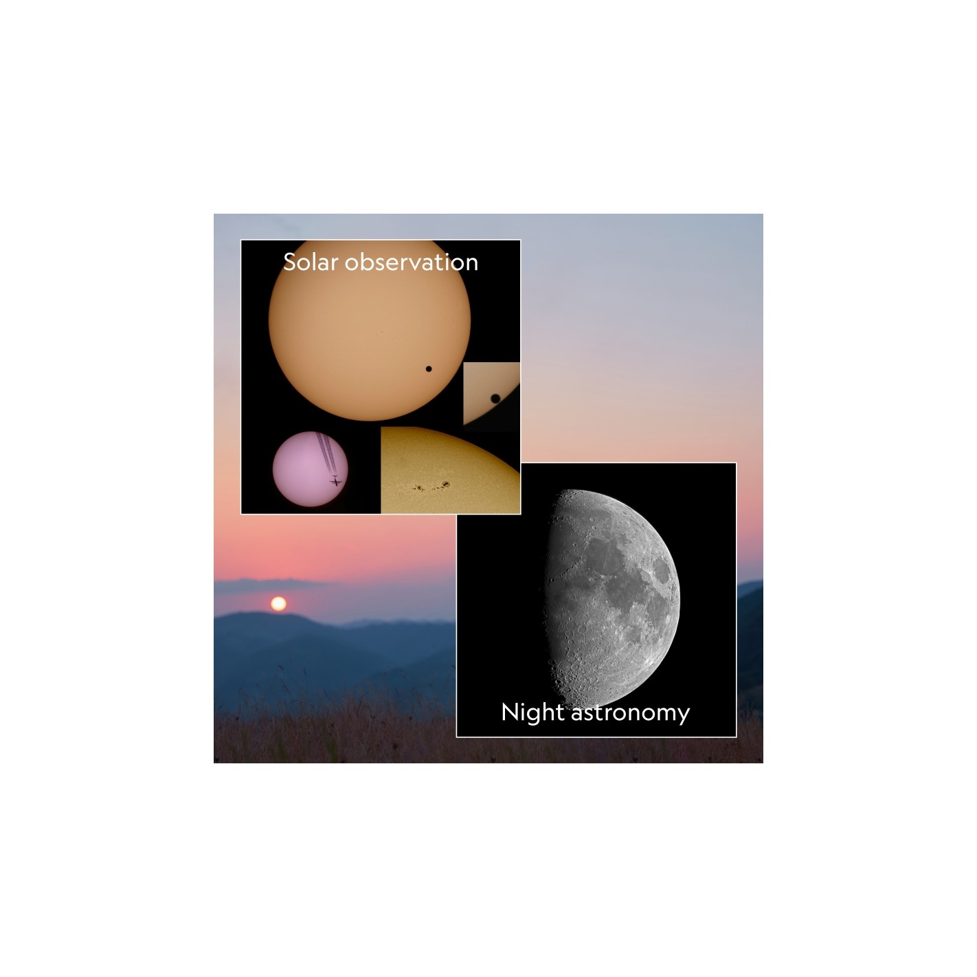Nunca ha sido más más fácil observar tanto el cielo nocturno como el Sol, a un precio sorprendentemente barato y - por último pero no menos importante – con total seguridad en la observación solar. Efectivamente, el filtro solar que ha sido diseñado especialmente para este telescopio lo hace posible. Contiene una lámina especial que protege el ojo contra todo tipo de radiación solar durante las observaciones: infrarrojos, ultra violeta y la luz visible se amortiguan a un nivel seguro, reduciendo la transmisión de la radiación solar en un 99,99%. Así, sólo una cantidad segura del espectro solar visible puede superar el filtro para crear una imagen solar maravillosa en el ocular. El nivel de seguridad de este filtro se ha comprobado mediante una empresa de control de calidad independiente para obtener todos los certificados CE que lo acreditan como instrumento astronómico seguro.