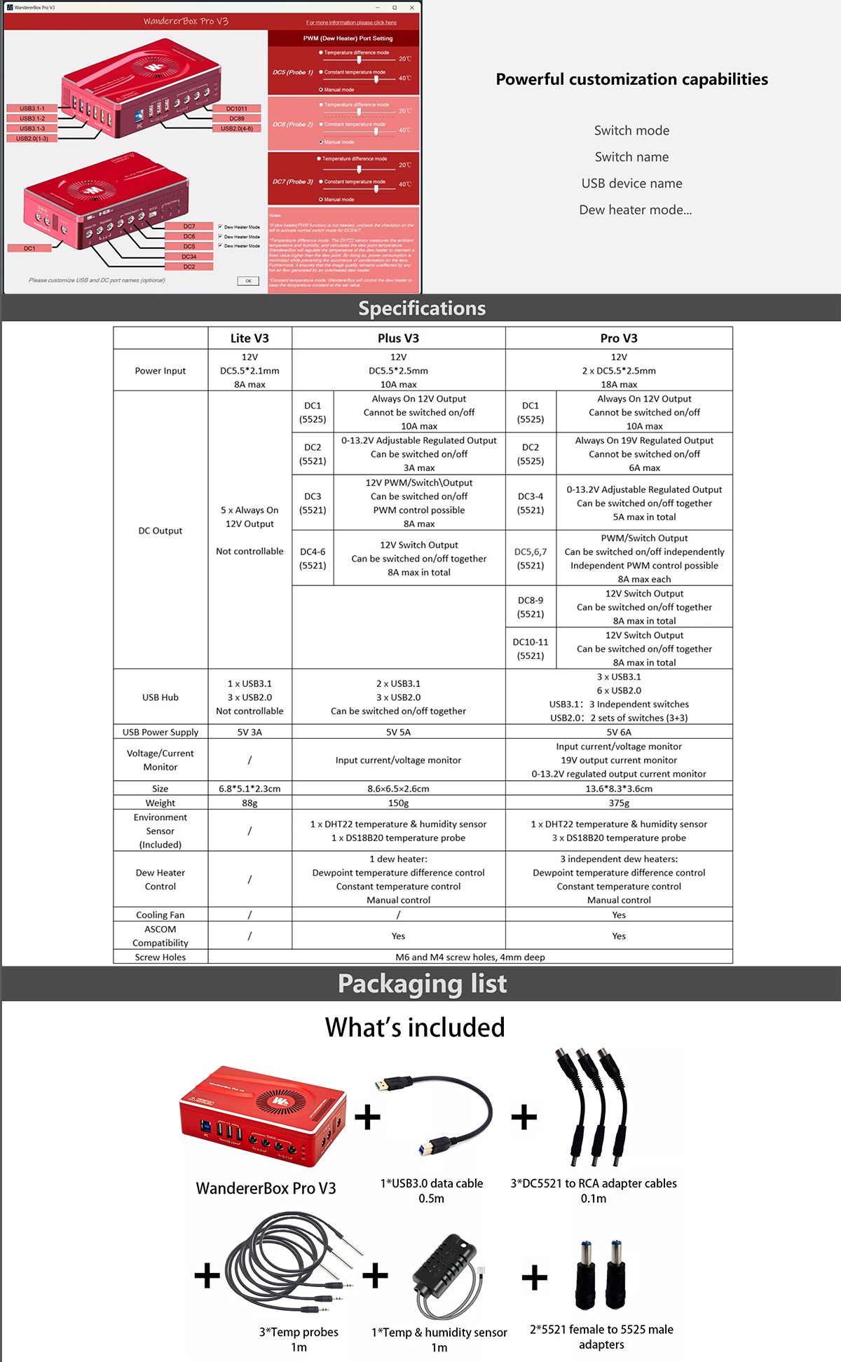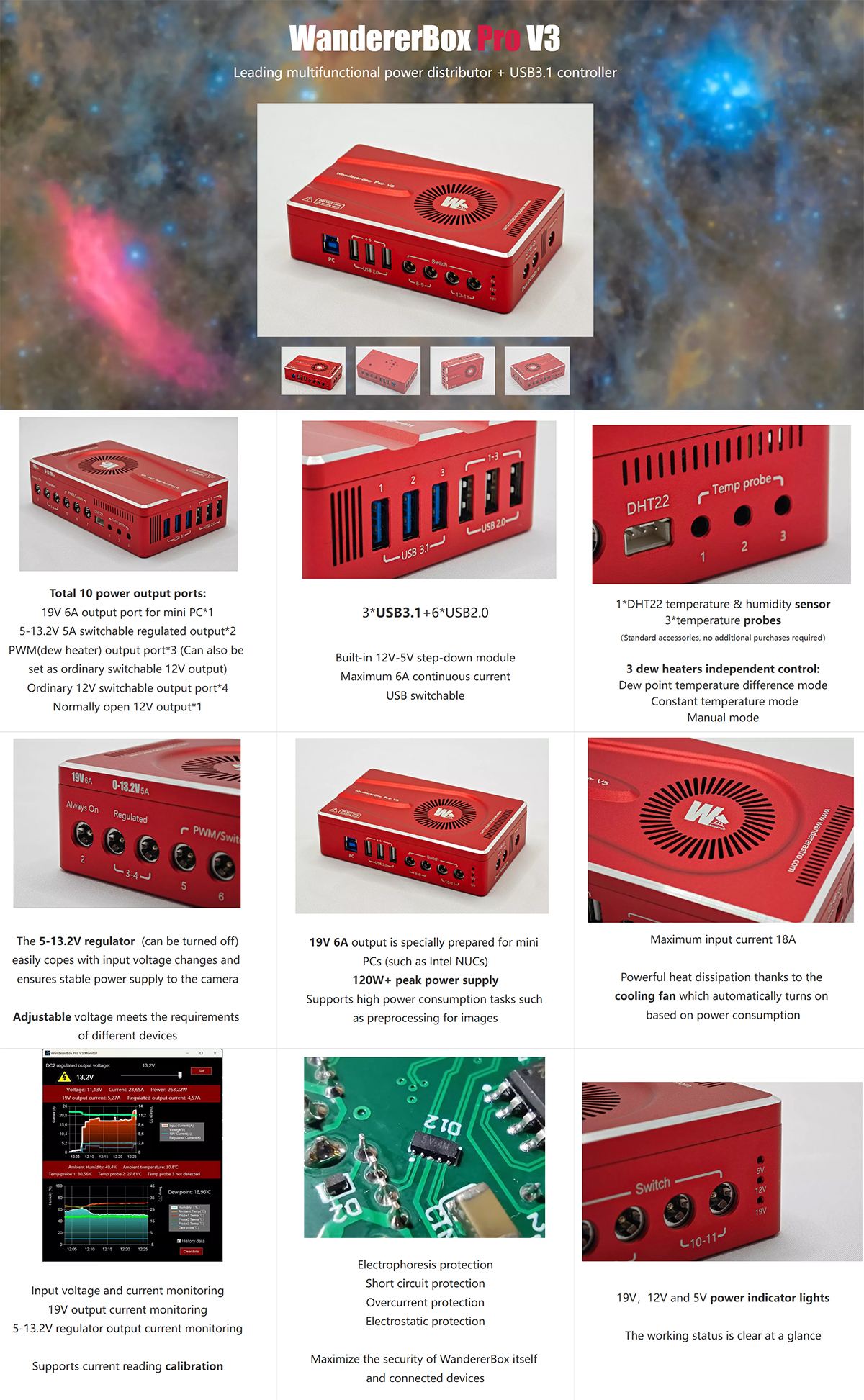 El WandererBox Pro V3 es la solución definitiva para alimentar, organizar y gestionar su equipo de astrofotografía. Diseñada para usuarios avanzados, combina alta capacidad de salida, control inteligente de temperatura y una robusta regulación de potencia en un único dispositivo compacto.
