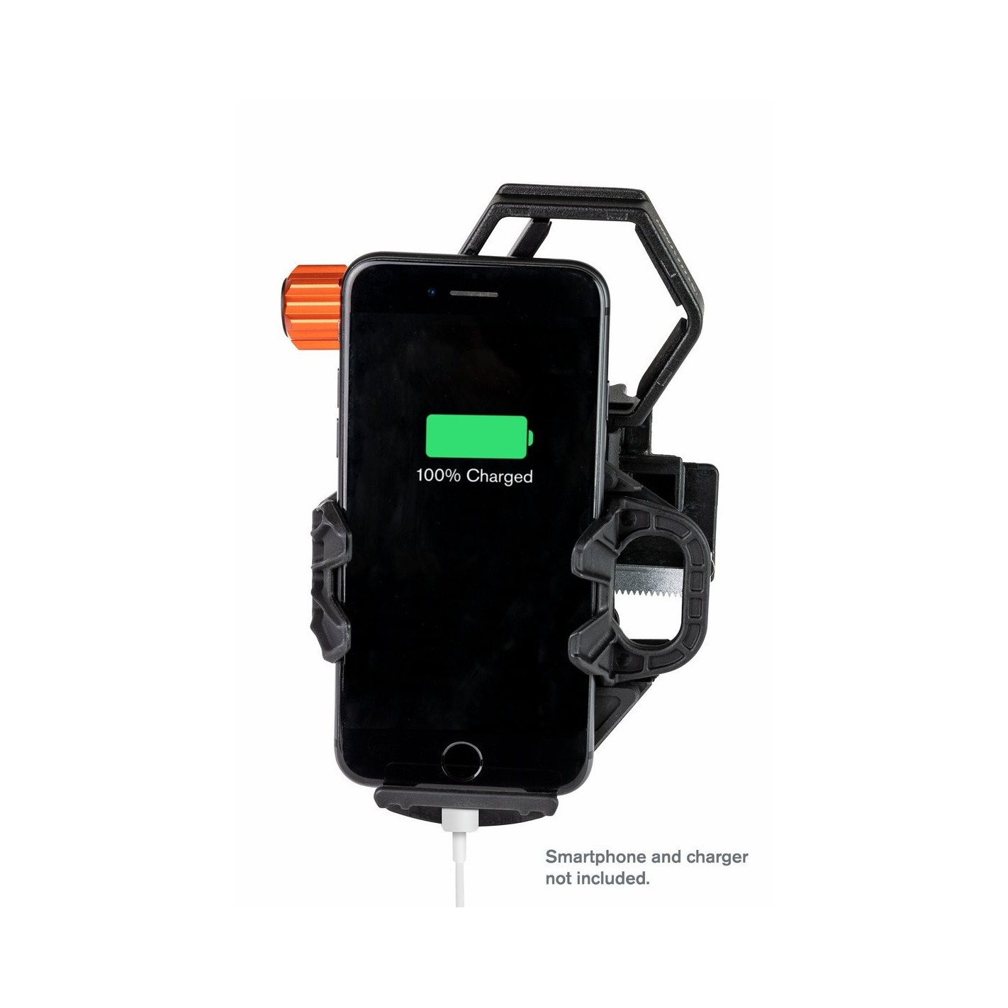 Las perillas de ajuste fino en eje X e Y de piñón y cremallera NexGO® son fantásticas para conseguir una alineación precisa y se pliegan hasta un tamaño muy compacto para facilitar el transporte. Asegure el adaptador de teléfono inteligente NexGO® a su ocular apretando la perilla naranja que sujetará la unidad alrededor del ocular.