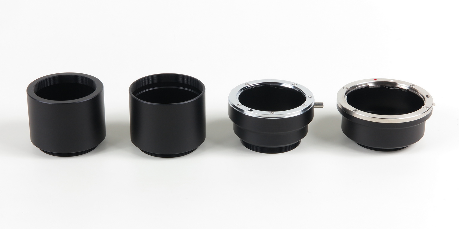 Cámara C1 (izquierda), tubo de extensión BFD de 55 mm con rosca M42 × 0,75 (centro) y con rosca M48 × 0,75 (derecha)