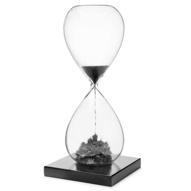 Una escultura transitoria en menos de un minuto. Un imán dentro de la base de madera atrae la arena metálica del reloj de arena.