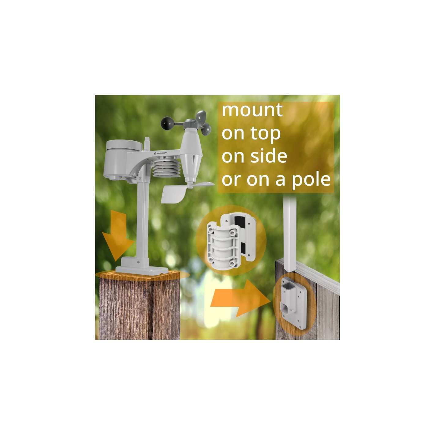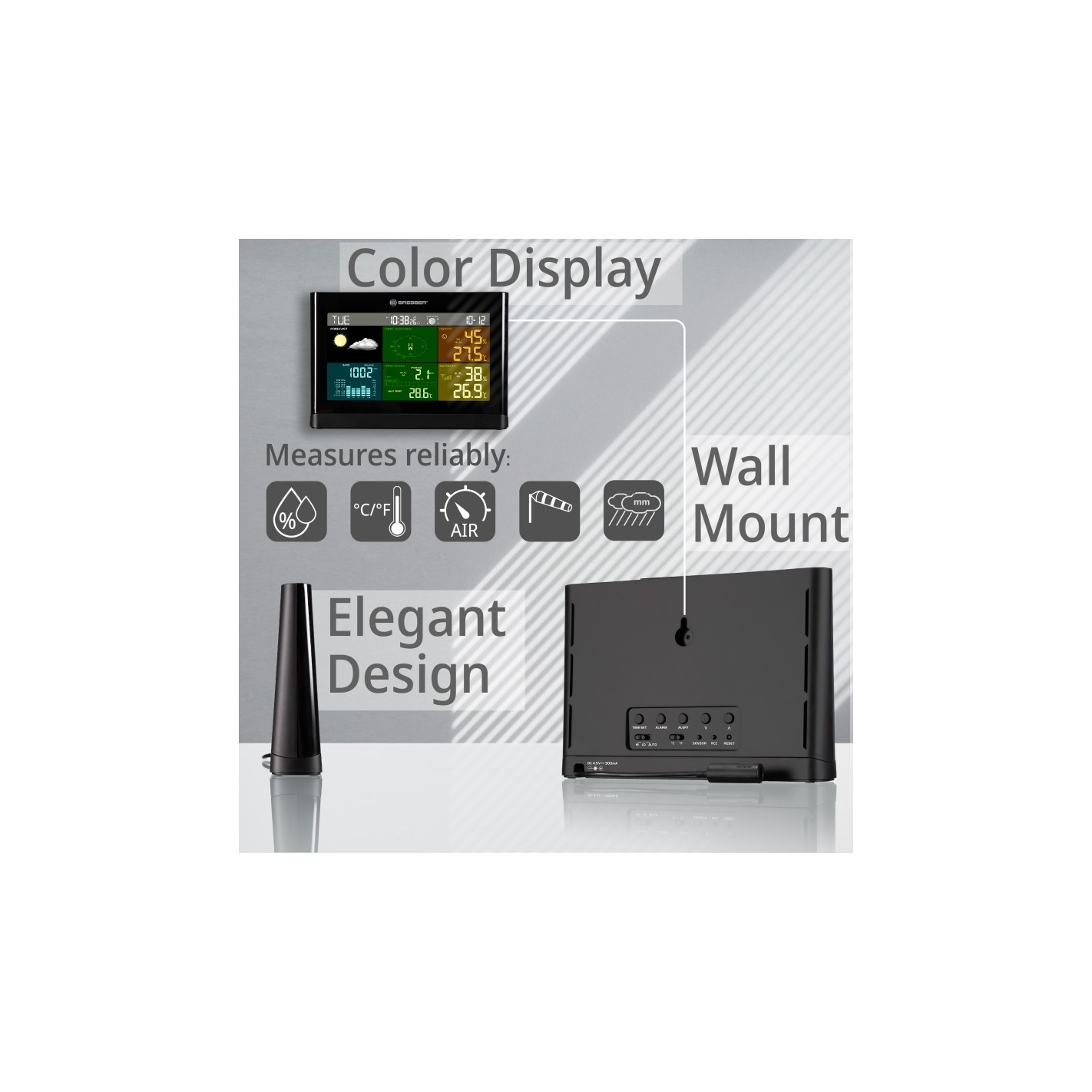 El nuevo Centro meteorológico BRESSER 5-en-1 Confort con pantalla en color combina de una manera única un diseño compacto con una amplia información meteorológica. Su sensor exterior multifunción, concebido con un diseño compacto, puede situarse en casi cualquier lugar sin precisar mucho espacio. Incluidas en la entrega, encontrarás unas abrazaderas de tubo y roscas (diámetro de las roscas 25-33 mm aprox.) para que pueda montarlo en mástiles, así como un pie abatible para su montaje en superficies llanas.
