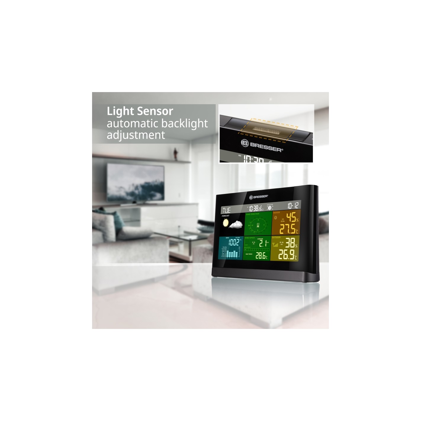 Un clima interior malo puede ser perjudicial para la salud de los niños y de la gente mayor. El Centro meteorológico 5 en 1 BRESSER también tiene una característica inteligente para esto: el indicador de clima de la habitación informa, mediante símbolos, sobre el estado del clima interior.