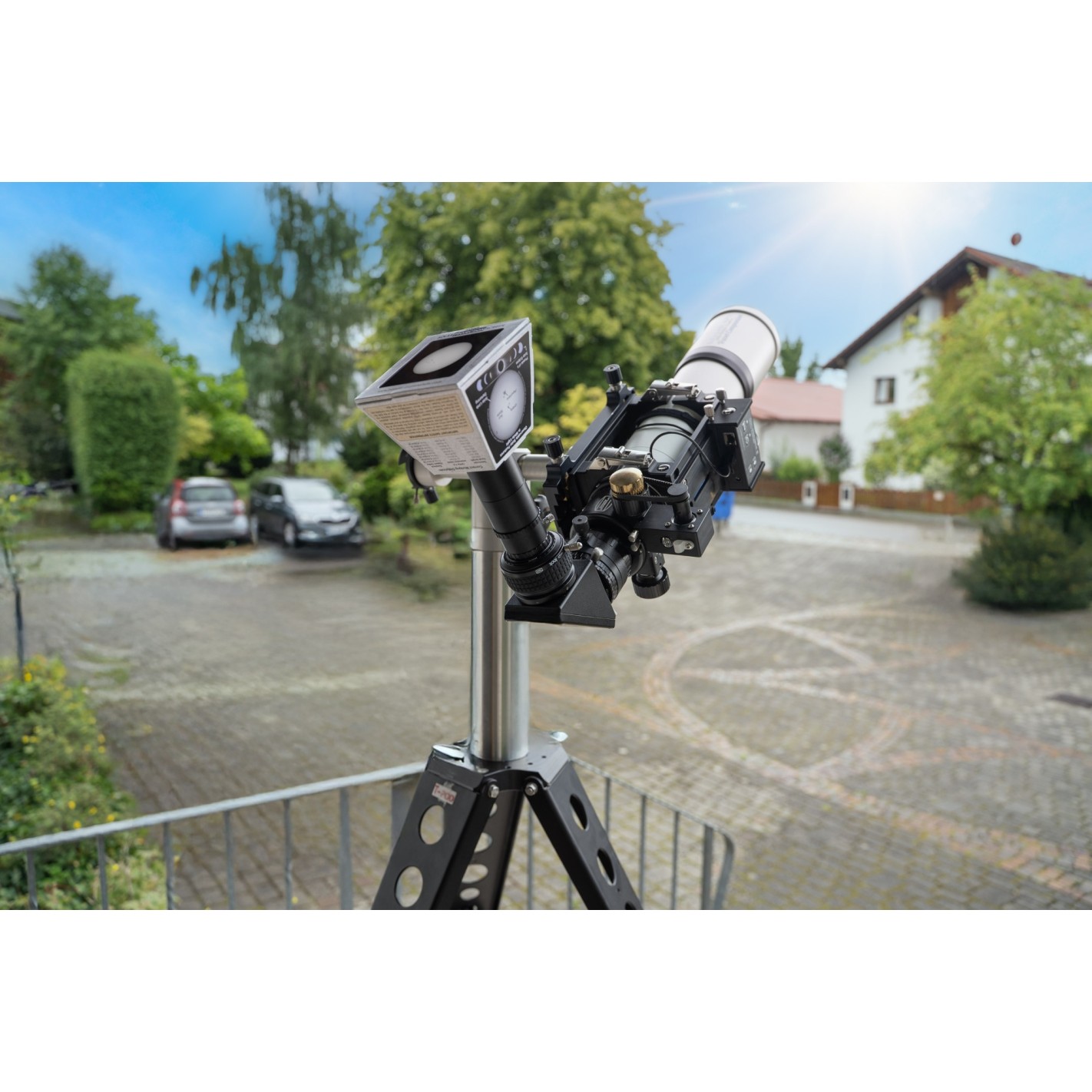 Cuando el telescopio está montado en una montura de seguimiento, se puede observar el Sol cómodamente durante varias horas. Si el montaje no está perfectamente alineado con el polo, el Sol se desplazará lentamente fuera del campo de visión. Desde la dirección de deriva, puedes ver durante el día en qué sentido se necesita corregir el montaje y así mejorar la alineación mientras observas. Las instrucciones detalladas para esto se pueden encontrar en el PDF del manual de operación. La pantalla de proyección es especialmente útil para la divulgación pública, cuando muchos invitados se turnan para mirar a través del ocular de un telescopio equipado con su propio filtro solar: si la pantalla está conectada a otro pequeño telescopio guía o buscador, puedes verificar si el Sol todavía está centrado en el telescopio principal y al mismo tiempo mostrar a los invitados en espera lo que pueden esperar.