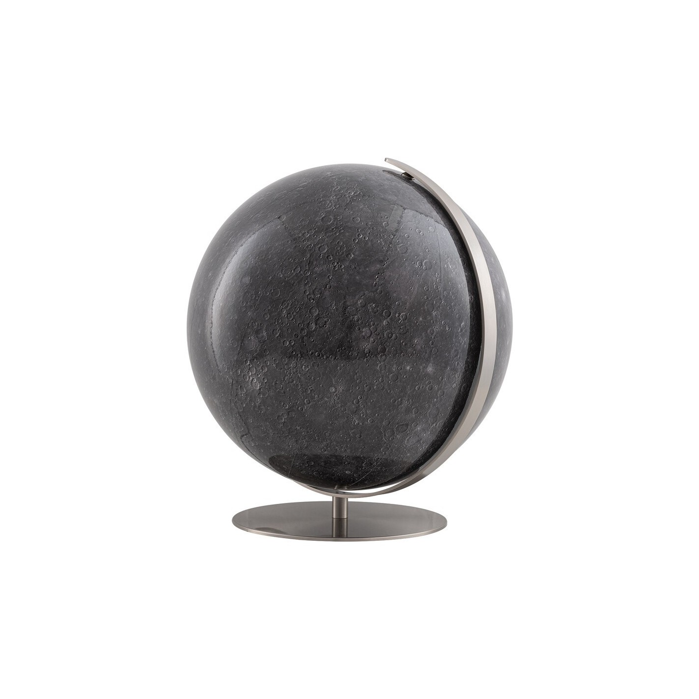 Globo terráqueo de cristal acrílico resistente a la rotura y al calor, y con la superficie recubierta a mano. La base y el meridiano son de acero inoxidable cepillado con acabado mate.