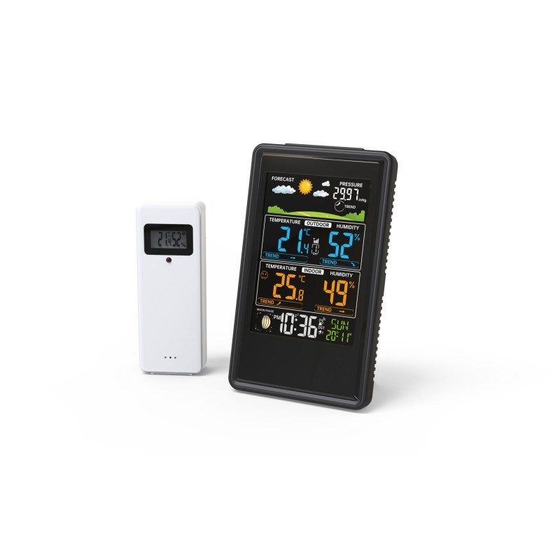La visualización de las fases lunares permite un seguimiento preciso del ciclo lunar. Ofrece pronósticos meteorológicos completos, con representación gráfica de las condiciones: soleado, parcialmente nublado, nublado, lluvia, tormenta y nieve. Mide con precisión la temperatura interior y exterior, así como el nivel de humedad relativa, indicando la tendencia climática (en aumento, en descenso o estable).Registra la presión atmosférica e indica su tendencia, útil para anticipar los cambios meteorológicos. Muestra en tiempo real índices meteorológicos avanzados, como el índice de calor y el punto de rocío, fundamentales para una evaluación precisa del confort ambiental. Guarda automáticamente los valores mínimos y máximos de temperatura y humedad, tanto para el ambiente interior como para el exterior, para un control completo a lo largo del tiempo. El nivel de confort interior se indica en tres niveles distintos, facilitando la regulación de la calefacción o la ventilación según las condiciones ambientales. Permite configurar alarmas específicas para temperatura y humedad máximas y mínimas, para ambas zonas (interior y exterior), ofreciendo un monitoreo activo y personalizado. El día de la semana se puede seleccionar en ocho idiomas: italiano, alemán, danés, inglés, español, francés, holandés y sueco. La retroiluminación de la pantalla es ajustable en tres niveles de brillo para adaptarse a cualquier condición de luz ambiental, de día y de noche. Cuenta con un indicador de batería baja, tanto para la unidad principal como para el sensor externo. Los siete botones funcionales garantizan una gestión sencilla e inmediata de todas las funciones de la estación. Funciona con un adaptador de CA incluido (CA 5V/150mA) y cuenta con un sistema de alimentación de respaldo con 2 pilas AA (no incluidas), para asegurar la continuidad operativa incluso en caso de apagón. Se incluye un sensor inalámbrico de temperatura y humedad, alimentado por 2 pilas AAA (no incluidas), con la posibilidad de expandir la red de monitoreo.
