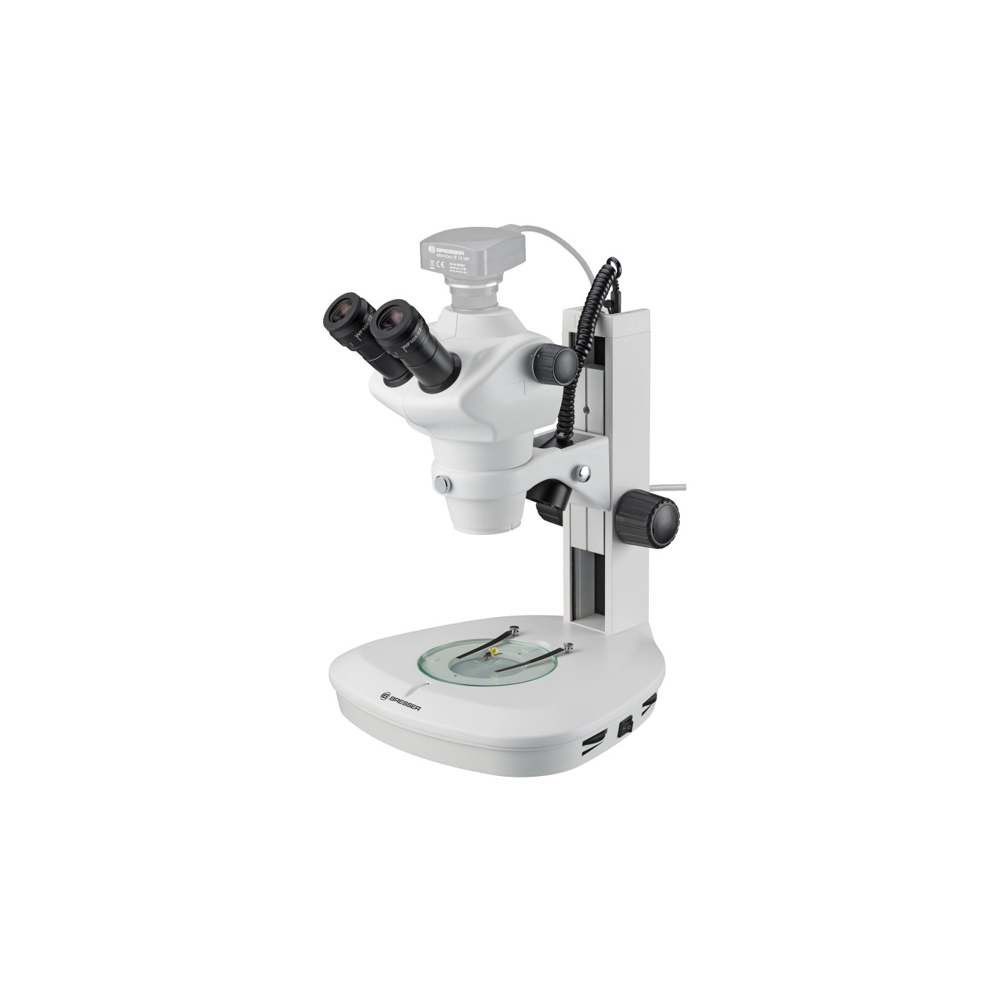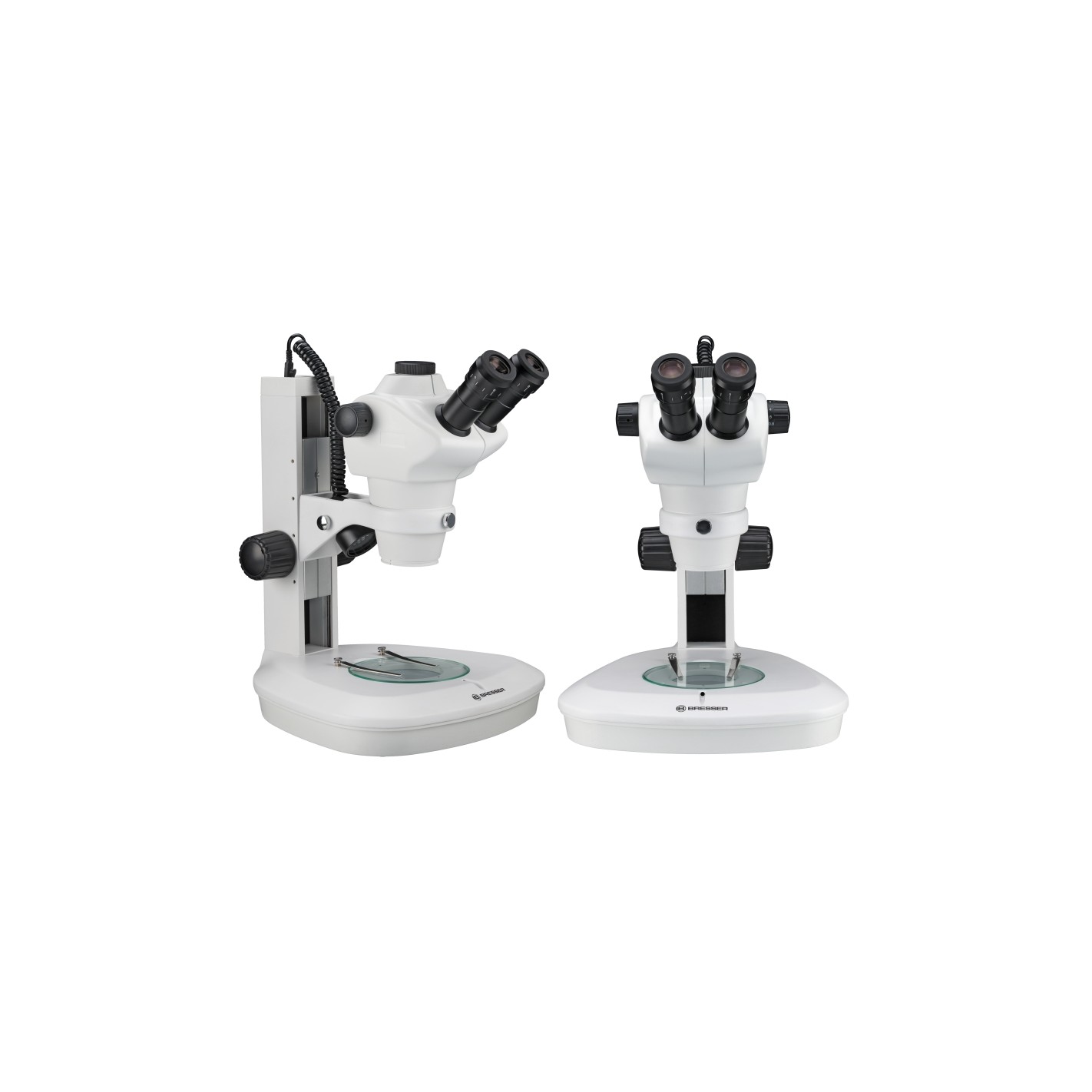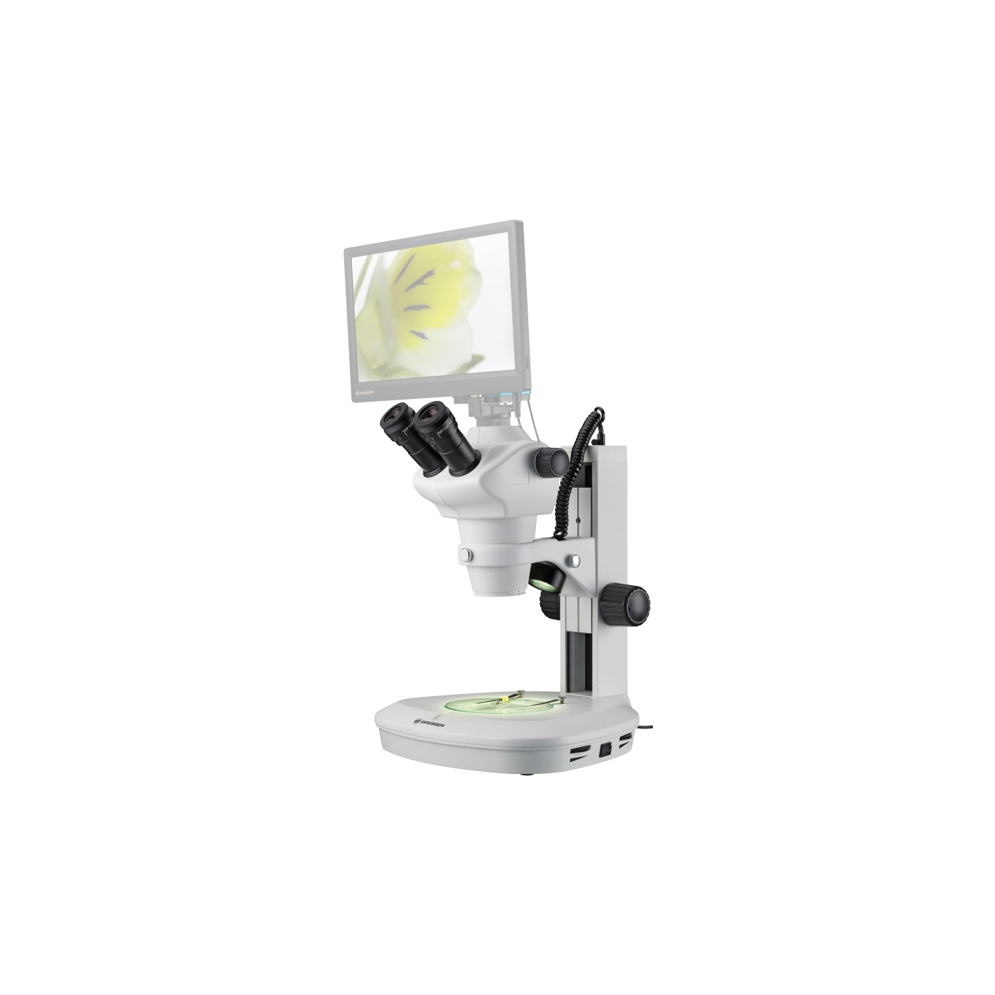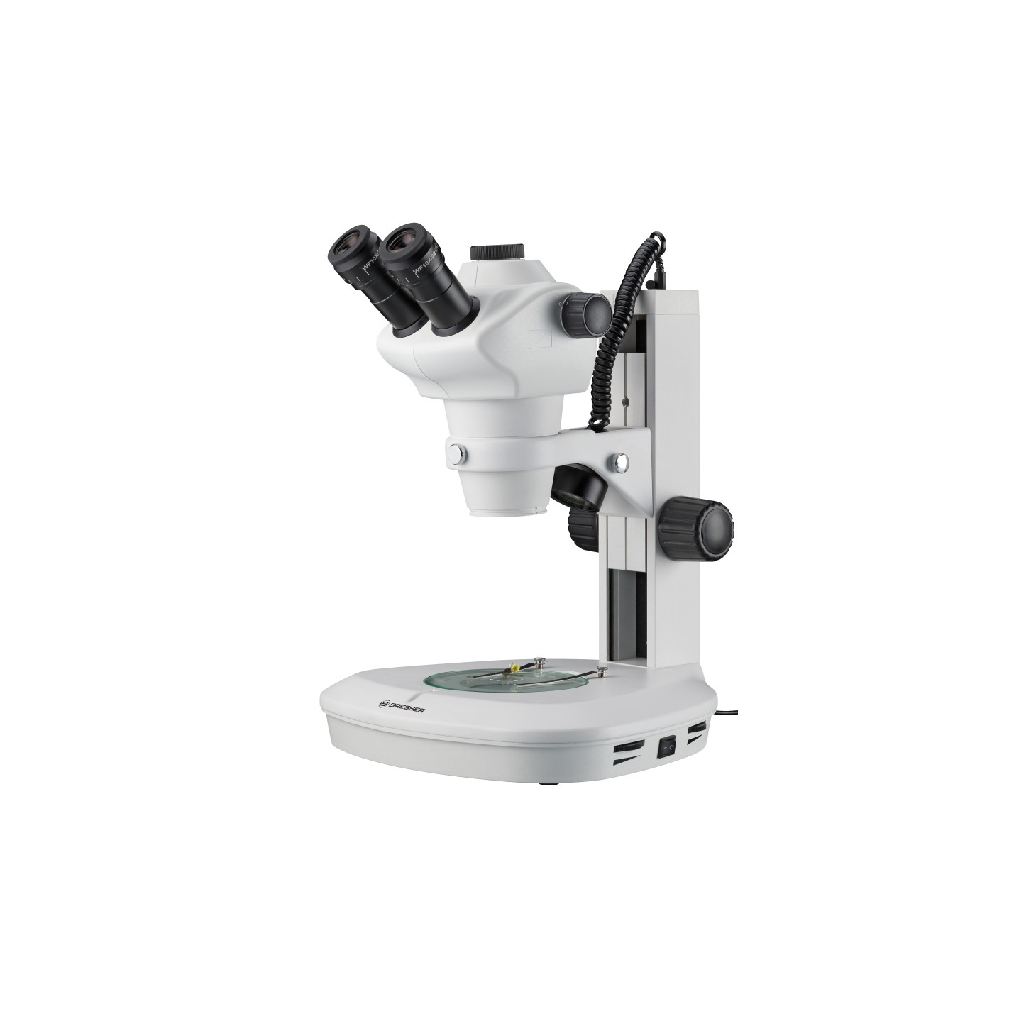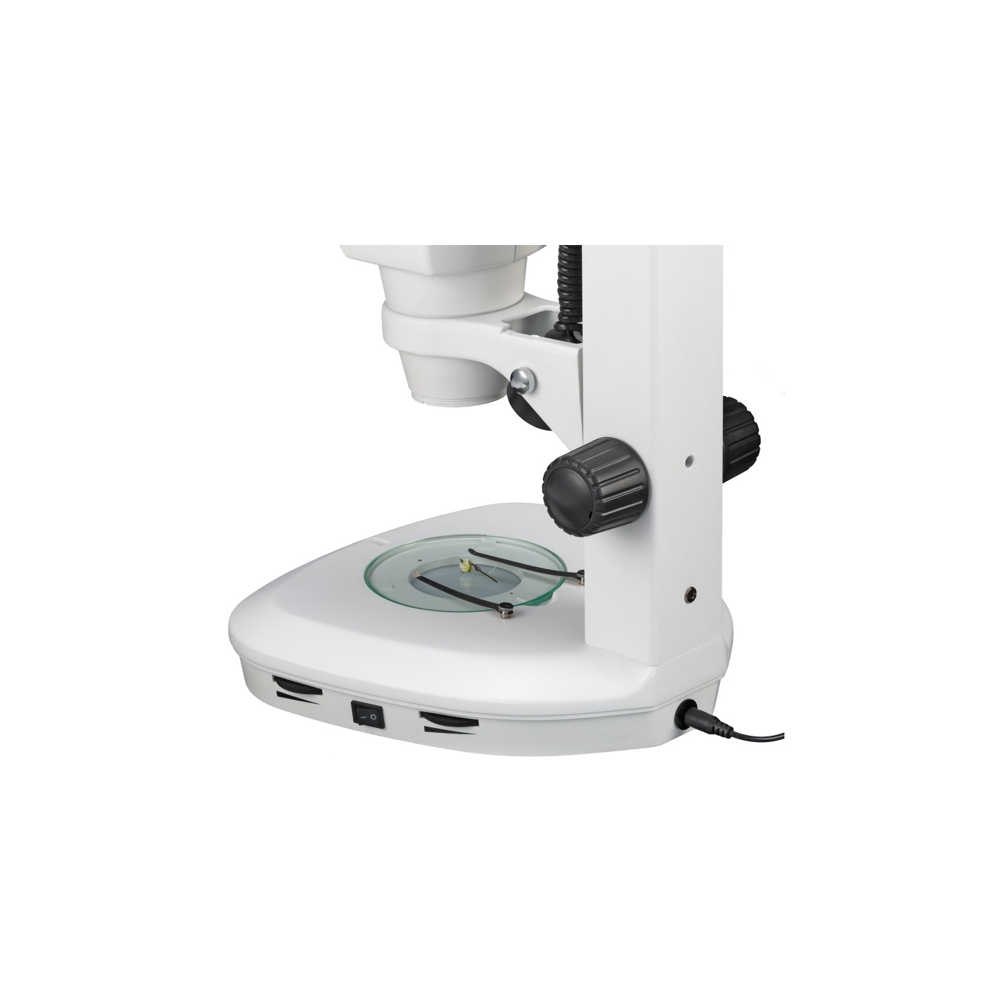 El pie extra ancho con plataforma y un rango de altura excepcionalmente alto permite observaciones de objetos de gran tamaño. La iluminación integrada de luz reflejada y transmitida puede utilizarse en combinación y es regulable. El ángulo de incidencia puede ajustarse de modo sencillo para el usuario y bloquearse en una posición determinada. Es posible un rango continuo de aumento desde 8x hasta 50x con los oculares de campo amplio intercambiables (WF 10x) y la lente del objetivo con zoom estéreo de 6,25 veces (0,8x-5x).