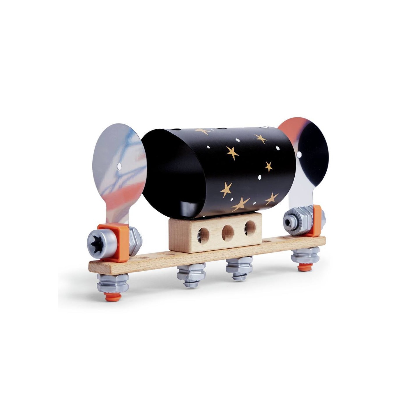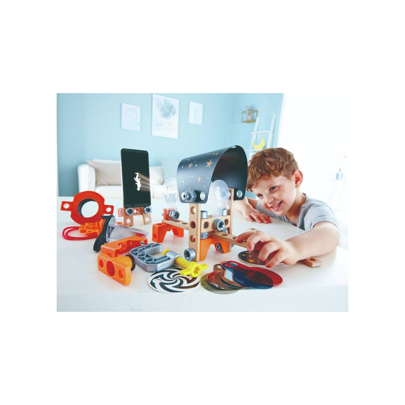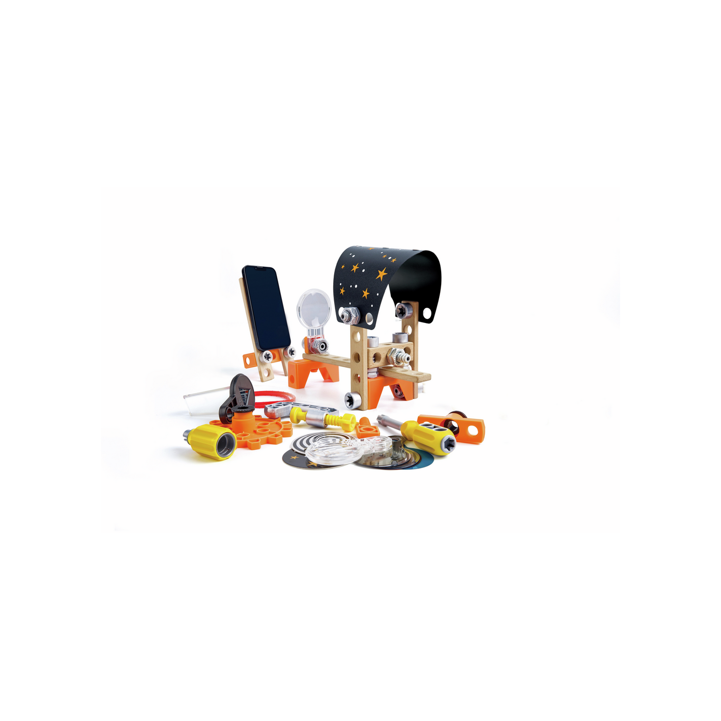 El set incluye bloques que se encajan mediante tornillos, tuercas, cuerdas, además de filtros de color, lentes, ilustraciones espaciales y pequeñas herramientas para montar los experimentos. Todos los componentes están diseñados para manos pequeñas, lo que facilita el montaje y manipulación por niños.