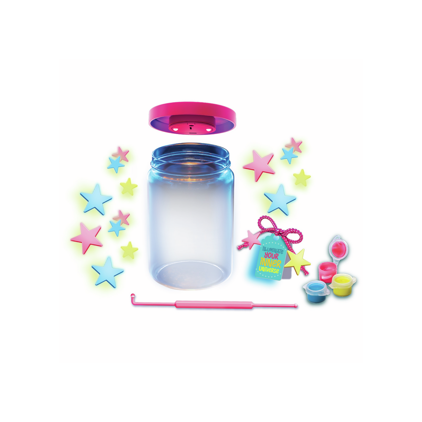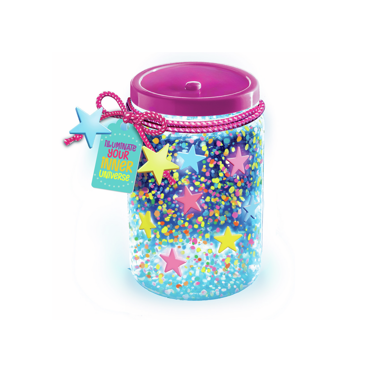 Un tarro luminoso y decorativo para crear tu propia galaxia: incluye un frasco con tapa LED, pinturas neón, estrellas que brillan en la oscuridad, una herramienta de pintura de doble punta, cordón decorativo y etiqueta. Ref. Y304804, ideal para niños desde 5 años
