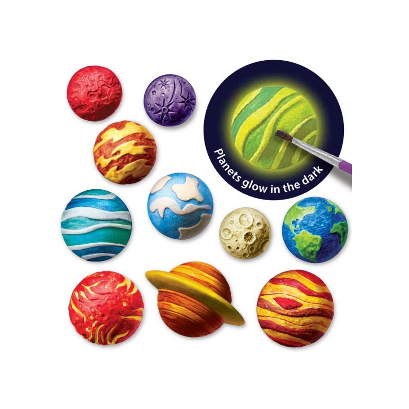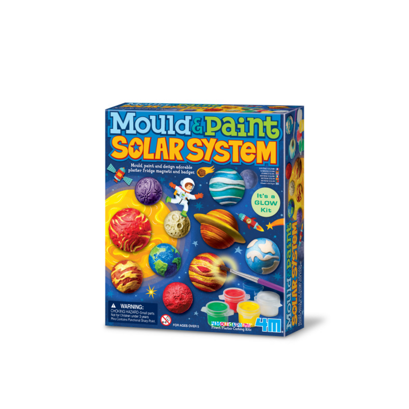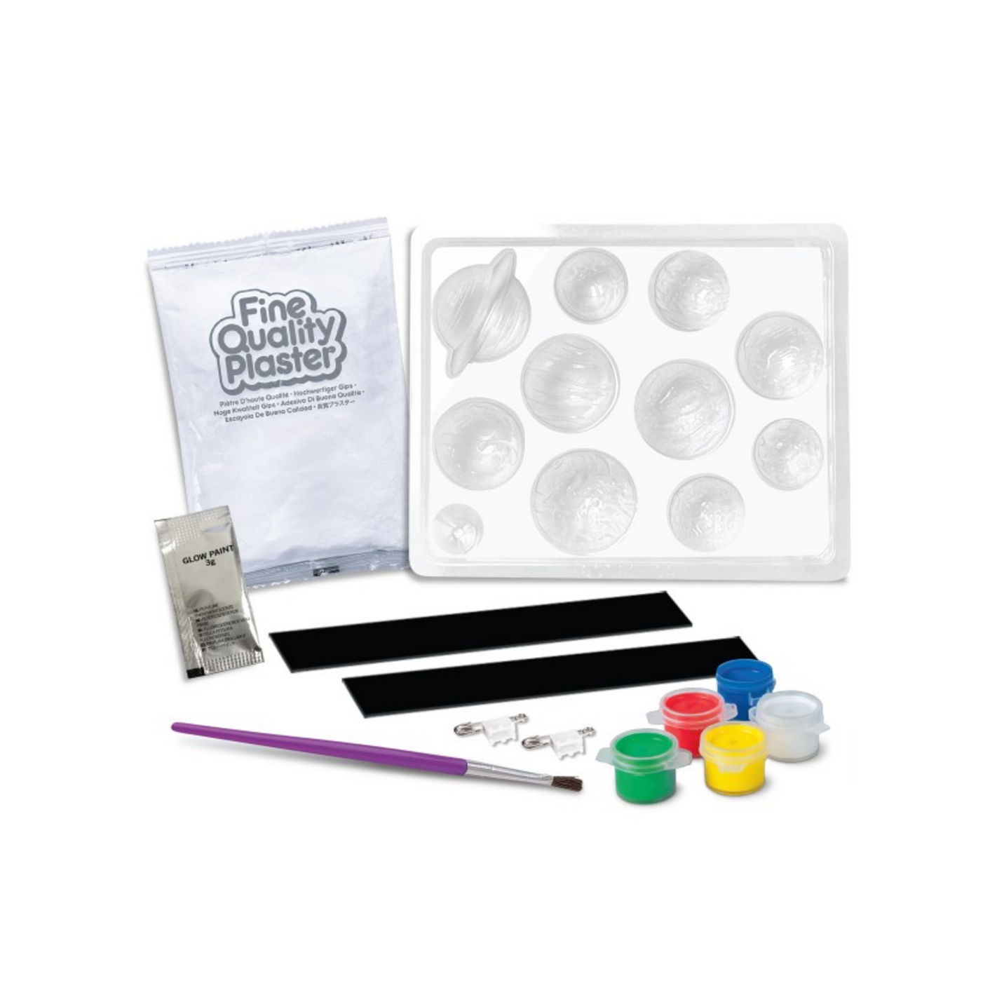 Un kit creativo para moldear y pintar figuras del Sistema Solar: incluye yeso, moldes para 10 planetas o cuerpos celestes, pintura fosforescente que brilla en la oscuridad, tiras imantadas y alfileres para transformar las figuras en imanes o chapas decorativas. Recomendado para niños a partir de 5 años. 4M Moldea y Pinta Sistema Solar