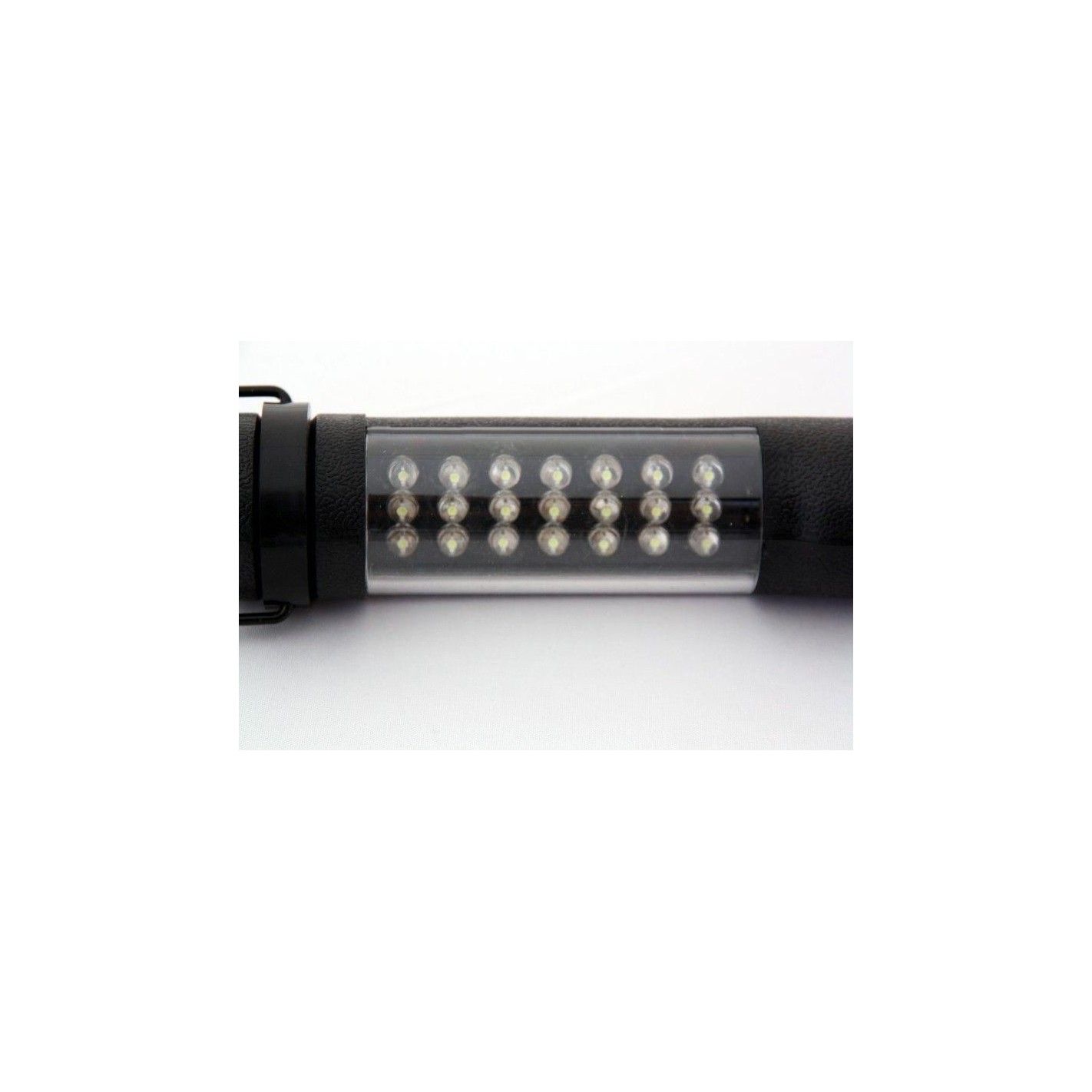 Lámpara LED portátil para el taller, vehículo, camping y hogar; 22 LEDs para una alta luminosidad: 21 LEDs para iluminación de superfície, 1 LED para iluminación frontal; 2 niveles conmutables; carcasa de plástico.
