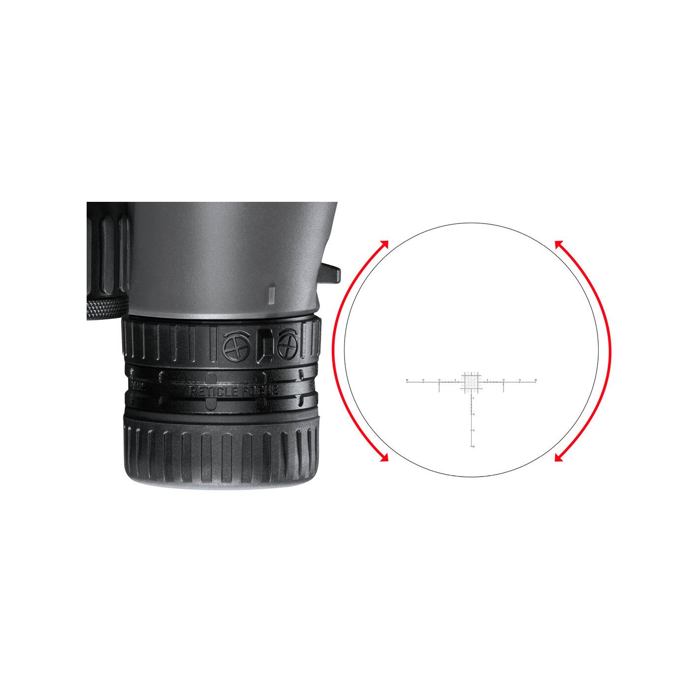 - Retícula Shot-Call MRAD. Proporciona marcas hash de 0.5 MIL para medición de rango y corrección de disparo. Posee su propio ajuste de enfoque.