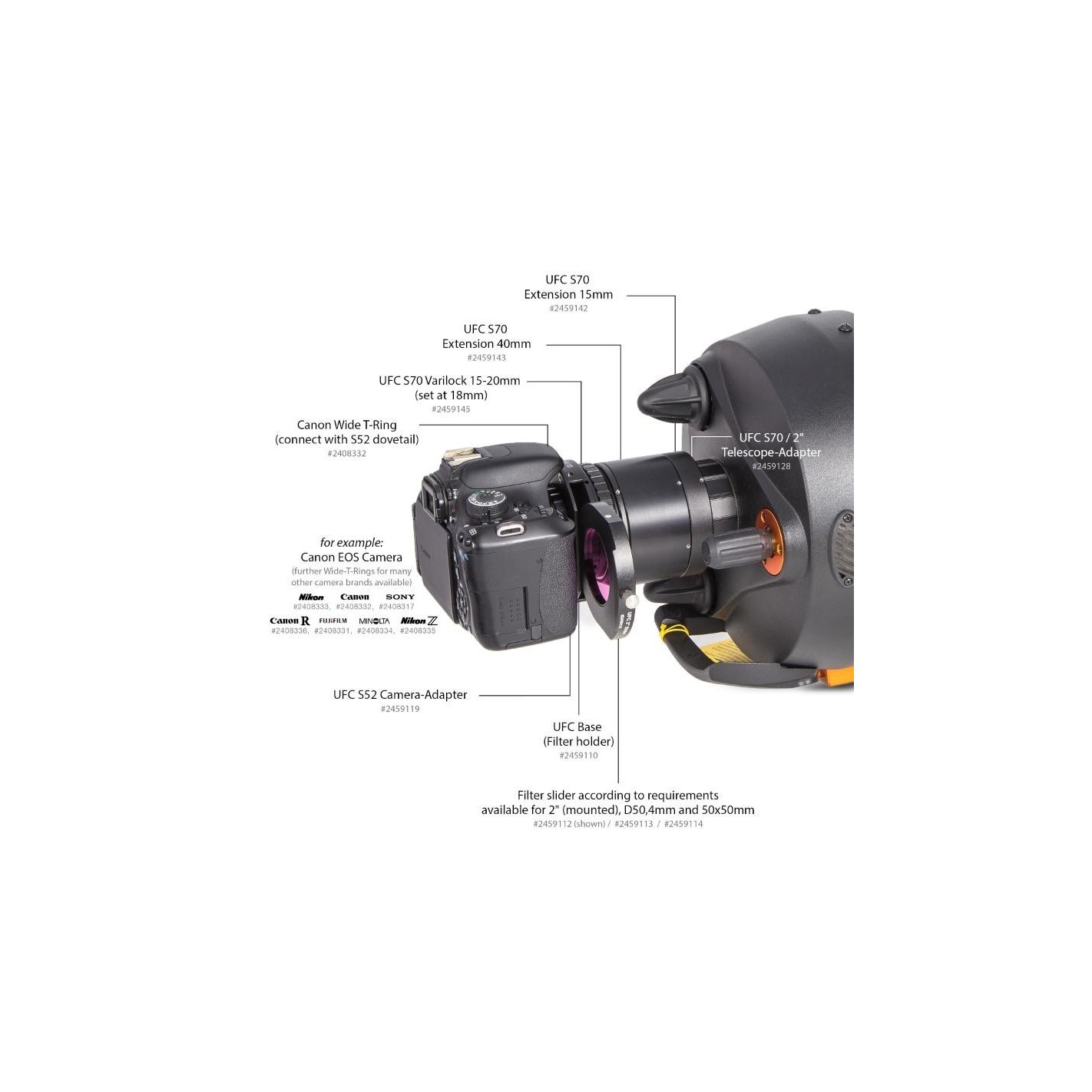 - Todos los anillos en T anchos de Baader se pueden adaptar directamente a un UFC (Universal Filter Changer) con el adaptador de cámara de cola de milano Baader UFC S52 opcional (# 2459119), para cambiar diferentes tamaños de filtro directamente en frente del sensor de la cámara.