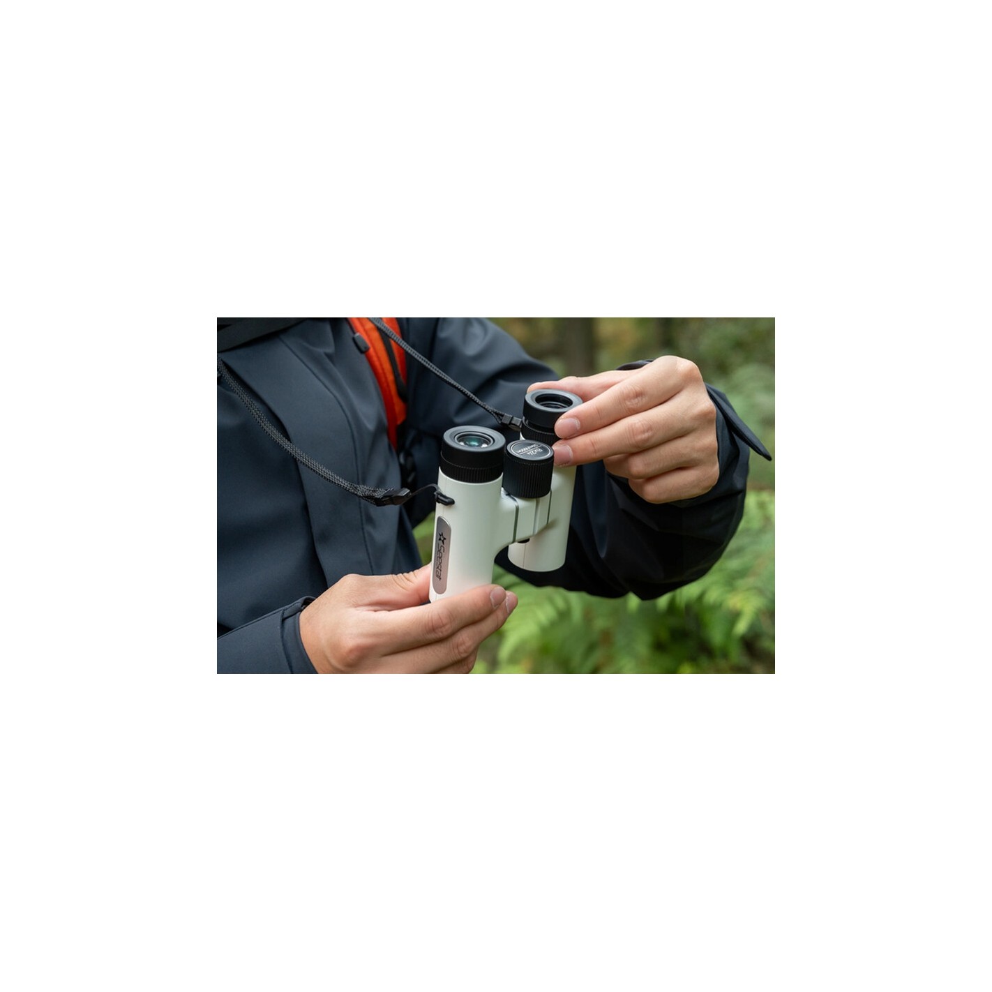 Los binoculares tienen un campo de visión sorprendentemente amplio, lo que le permite abarcar paisajes sin esfuerzo o seguir el vuelo de un pájaro. Esto también supone una ventaja frente a los binoculares con un campo de visión más estrecho en eventos deportivos o conciertos. Los observadores sin experiencia y los niños se benefician especialmente de un campo de visión amplio.